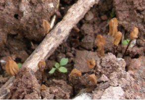 2.除草 果桑菌核病的菌核在桑園雜草生長濕潤的地方易萌發(fā)生長子實體,3月上旬應(yīng)對果桑園進行一次人工除草或噴施一次除草劑,既除雜草同時又能殺滅已萌發(fā)的菌核子囊盤。此外在3月上、中旬巡查果桑園,如發(fā)現(xiàn)果桑菌核萌發(fā)的子實體時(圖1、圖2),可立即噴灑除草劑,點殺桑菌核病的子實體及子囊盤,既節(jié)約大量藥劑又精準(zhǔn)點殺。