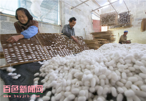 凌云縣2015年第一批蠶繭于4月16日新鮮上市,據(jù)悉,該縣是百色市2015年第一批蠶繭上市縣。現(xiàn)在全縣的蠶農(nóng)都在蠶棚里忙碌地整理上簇蠶繭、收繭拿去上市,現(xiàn)在蠶繭地市場(chǎng)價(jià)為每公斤40元,預(yù)計(jì)全縣蠶農(nóng)2015年第一批蠶繭上市收入達(dá)100萬(wàn)元以上。目前凌云縣有桑園面積8萬(wàn)畝,投產(chǎn)桑園5萬(wàn)畝,2015年,全縣計(jì)劃養(yǎng)蠶5萬(wàn)張,鮮繭產(chǎn)量4萬(wàn)擔(dān),新建大蠶房20000平方米,小蠶共育室2000平方米,蠶沙處理池2000立方米,預(yù)計(jì)年產(chǎn)值達(dá)7600萬(wàn)元以上。