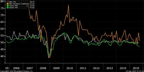 周四,國家統(tǒng)計局將發(fā)布9月份采購經(jīng)理指數(shù),財新將公布財新中國PMI終值。財新9月份中國PMI初值從8月份的47.3跌至47,已經(jīng)降低了市場預(yù)期。如果國家統(tǒng)計局9月份的PMI從8月份的49.7進(jìn)一步下跌,會給中國經(jīng)濟(jì)增長減速以及刺激政策未能拉升經(jīng)濟(jì)進(jìn)一步敲響警鐘。官方PMI偏重全國規(guī)模以上國有企業(yè),這些企業(yè)是貸款成本降低和其它政府支持政策的最先受益者。