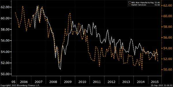 還將于周四公布的數(shù)據(jù)有國家統(tǒng)計局9月份非制造業(yè)PMI和財新中國服務(wù)業(yè)PMI。今年大多數(shù)時候一直都是服務(wù)業(yè)相對強(qiáng)勁,抵消了制造業(yè)的相對疲軟。8月份服務(wù)業(yè)PMI下滑讓這一描述是否繼續(xù)適用受到懷疑。若9月份服務(wù)業(yè)PMI進(jìn)一步下跌,尤其是如果還有跡象表明服務(wù)業(yè)在裁員,則會是令人不安的跡象。