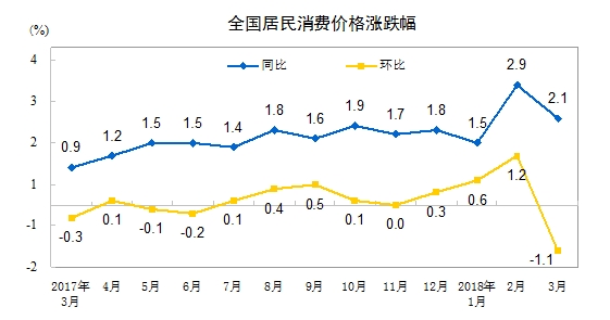 2018年3月份,全國(guó)居民消費(fèi)價(jià)格同比上漲2.1%。其中,城市上漲2.1%,農(nóng)村上漲1.9%;食品價(jià)格上漲2.1%,非食品價(jià)格上漲2.1%;消費(fèi)品價(jià)格上漲1.6%,服務(wù)價(jià)格上漲2.8%。一季度,全國(guó)居民消費(fèi)價(jià)格總水平比去年同期上漲2.1%。