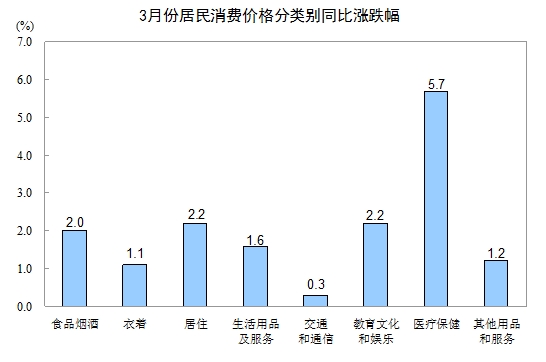 從同比看,CPI漲幅比上月回落0.8個(gè)百分點(diǎn)。食品價(jià)格上漲2.1%,漲幅比上月回落2.3個(gè)百分點(diǎn),影響CPI上漲約0.41個(gè)百分點(diǎn)。其中,雞蛋、鮮菜和鮮果價(jià)格分別上漲21.1%、8.8%和7.4%,合計(jì)影響CPI上漲約0.43個(gè)百分點(diǎn)。非食品價(jià)格上漲2.1%,漲幅比上月回落0.4個(gè)百分點(diǎn),影響CPI上漲約1.65個(gè)百分點(diǎn)。其中,醫(yī)療保健類(lèi)價(jià)格上漲5.7%,教育服務(wù)類(lèi)價(jià)格上漲2.7%,居住類(lèi)價(jià)格上漲2.2%。據(jù)測(cè)算,在3月份2.1%的同比漲幅中,去年價(jià)格變動(dòng)的翹尾影響約為1.3個(gè)百分點(diǎn),新漲價(jià)影響約為0.8個(gè)百分點(diǎn)。