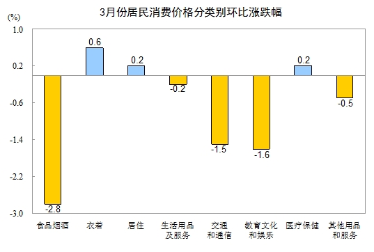 3月份,全國(guó)居民消費(fèi)價(jià)格環(huán)比下降1.1%。其中,城市下降1.1%,農(nóng)村下降1.2%;食品價(jià)格下降4.2%,非食品價(jià)格下降0.4%;消費(fèi)品價(jià)格下降1.4%,服務(wù)價(jià)格下降0.7%。