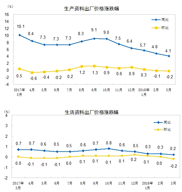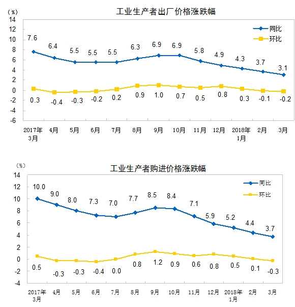 2018年3月份,全國(guó)工業(yè)生產(chǎn)者出廠價(jià)格同比上漲3.1%,環(huán)比下降0.2%。工業(yè)生產(chǎn)者購(gòu)進(jìn)價(jià)格同比上漲3.7%,環(huán)比下降0.3%。一季度,工業(yè)生產(chǎn)者出廠價(jià)格同比上漲3.7%,工業(yè)生產(chǎn)者購(gòu)進(jìn)價(jià)格同比上漲4.4%。