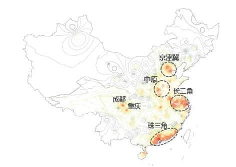 經(jīng)歷過2016年以前的遷移,人口分布呈現(xiàn)怎樣的特征呢?從2016年我國人口密度等高線來看,京津冀、長三角、珠三角三大城市群的人口密度最高,此外中原地區(qū)人口也較為密集,重慶、成都也存在兩個人口高密度點,可見,人口扎堆聚集在這些區(qū)域。