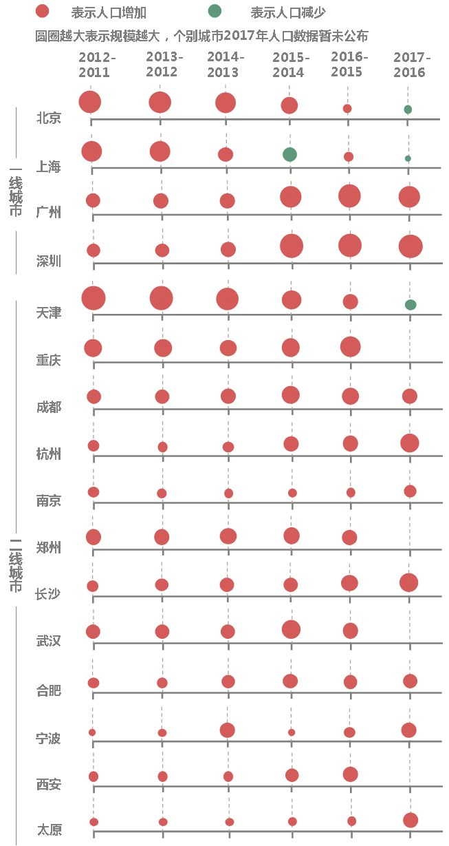 2017年省份+直轄市發(fā)展?jié)摿D注:氣泡大小表示近一年的人口增量,氣泡越大,增量越大,空心氣泡表示人口減少數(shù)據(jù)來源:省統(tǒng)計年鑒,城市統(tǒng)計公報