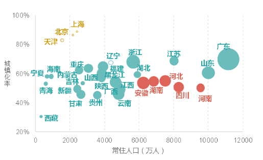 對比看下能夠反映各省份和直轄市發(fā)展基礎、成熟度和活躍度的指標——常住人口、城鎮(zhèn)化率以及近一年的人口增量,我們得到了這樣一個表現(xiàn)省市發(fā)展?jié)摿Φ臍馀輬D: