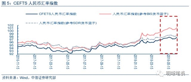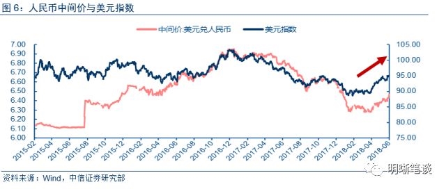 本次人民幣貶值主要原因是美元走強(qiáng),CEFTS人民幣匯率指數(shù)與美元兌人民幣中間價(jià)出現(xiàn)了背離。4月以來(lái)CEFTS人民幣匯率指數(shù)呈波動(dòng)上升的趨勢(shì),盡管5月CFETS人民幣匯率指數(shù)貶值0.14%,但并未表現(xiàn)出對(duì)人民幣對(duì)美元的跟隨貶值趨勢(shì),人民幣匯率韌性相對(duì)較強(qiáng)。美元走強(qiáng)是本次人民幣貶值的重要原因。2018年4月2日以來(lái)美元兌人民幣中間價(jià)累計(jì)下落1942點(diǎn)。2018年6月20日美元指數(shù)達(dá)到95.1234的高位,為2017年7月以來(lái)最高值。美聯(lián)儲(chǔ)主席鮑威爾發(fā)表的鷹派講話是支撐美元指數(shù)攀升的主要原因。鮑威爾表示,美聯(lián)儲(chǔ)進(jìn)一步收緊貨幣政策的理由“很強(qiáng)烈”。此外,歐洲央行管委諾沃特尼發(fā)表的鴿派言論打壓歐元走軟的同時(shí)也是支撐美元指數(shù)攀升的重要因素。