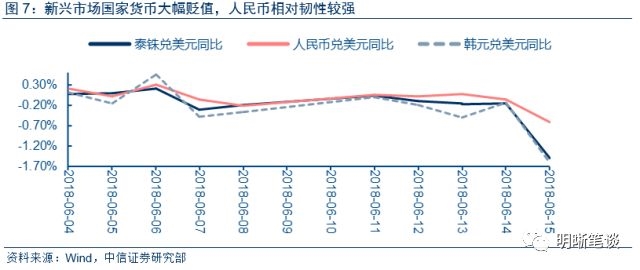 強(qiáng)勢(shì)美元給全球市場(chǎng)帶來(lái)巨大的波動(dòng),新興市場(chǎng)國(guó)家貨幣更是呈多米諾骨牌式貶值,人民幣相對(duì)韌性較強(qiáng)。可以看到,上周(6月11日-6月15日)新興市場(chǎng)國(guó)家除巴西外均表現(xiàn)為貶值狀態(tài)。俄羅斯羅布、阿根廷比索、土耳其里拉、巴黎雷亞爾、菲律賓比索等貨幣年內(nèi)相繼大幅貶值。 MSCI新興市場(chǎng)貨幣指數(shù)繼四月高點(diǎn)后已下降超過(guò)4%。國(guó)際金融研究所的數(shù)據(jù)顯示,五月份新興市場(chǎng)資本流出創(chuàng)自16年11月以來(lái)新高,達(dá)到123億美元,并大約平分在股市和債市,其中亞洲新興市場(chǎng)流出資本80億。