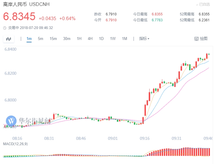 中間價(jià)定價(jià)后,離岸人民幣兌美元半小時(shí)內(nèi)接連跌破6.80、6.81、6.82、6.83四道關(guān)口,日內(nèi)跌超400點(diǎn)。