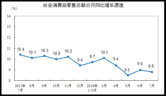 今天公布的7月社會消費品零售總額數據同比8.8%,不及預期和前值,持續(xù)低迷。