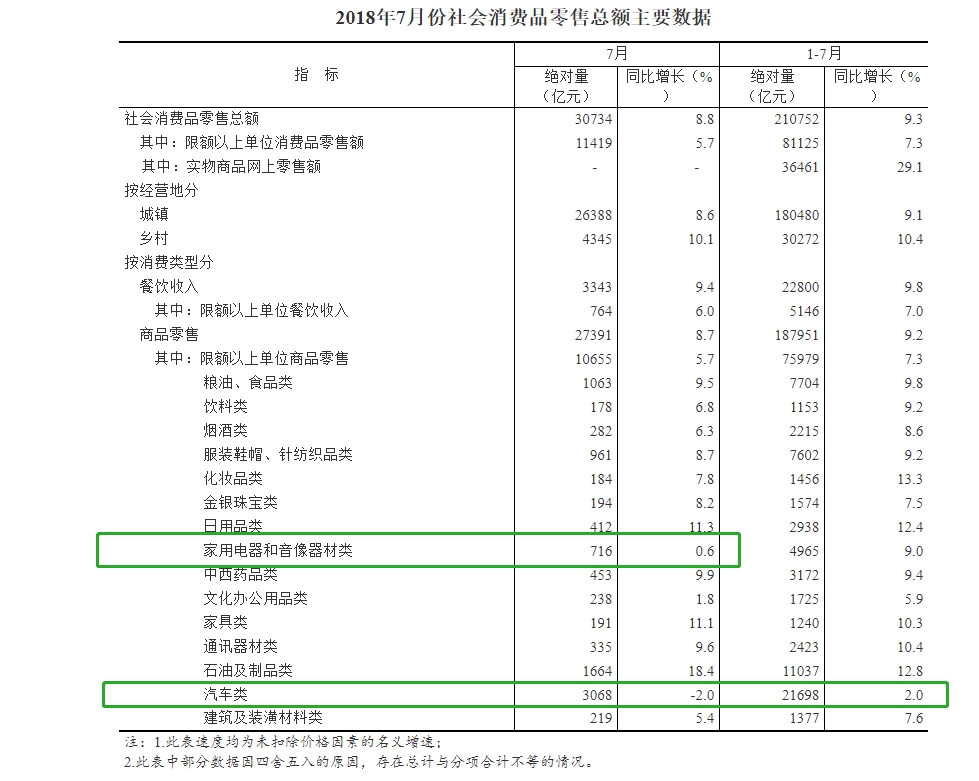 其中,汽車類零售總額3068億元,同比增速為-2.0%,跌幅較6月(-7.0%)縮小,已連續(xù)三個月負增長;家用電器和音像器材類零售總額716億元,同比增速0.6%,較6月14.3%的漲幅大為收窄。