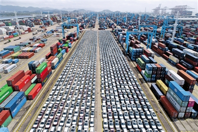 圖為日前出口馬來(lái)西亞的國(guó)產(chǎn)汽車(chē)在寧波舟山港等待裝船。