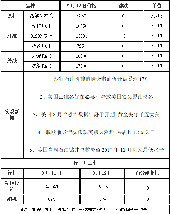 中秋假期市場并不平靜,沙特石油設(shè)施遇襲導(dǎo)致國際原油期貨暴漲,滌綸短纖類聚酯產(chǎn)品成交均或受此帶動(dòng),周末價(jià)格存在上揚(yáng)現(xiàn)象,而粘膠短纖在經(jīng)歷階段性成交后市場整體信心因下游訂單欠佳而無法確立之時(shí),周日長樂地區(qū)人棉紗價(jià)通知上移,至此粘膠短纖價(jià)格重心或暫得以支撐,同時(shí)為保證回款狀態(tài)下,本周粘膠短纖價(jià)格重心或逐步適度上移。