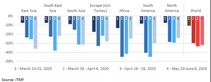 在全球范圍內(nèi),當(dāng)前訂單繼續(xù)平均下降超過40%(圖1)。訂單取消和推遲比列在30%(東南亞)和55%(南美)之間。
