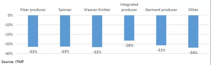 圖2:全球紡織品價值鏈所有生產(chǎn)部門訂單減少幅度在37%和46%之間。