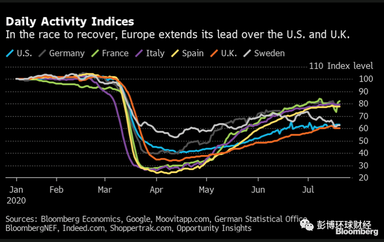但高頻數(shù)據(jù)表明,歐洲的復(fù)蘇速度更快, 彭博經(jīng)濟(jì)研究預(yù)估這種領(lǐng)先優(yōu)勢近期擴(kuò)大了。
