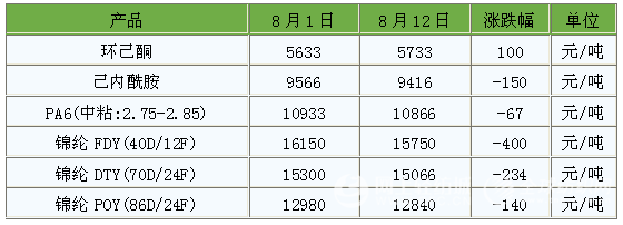 據(jù)生意社數(shù)據(jù)統(tǒng)計,截止到8月12日,江蘇地區(qū)錦綸長絲DTY報15066元/噸,較8月1日價格下跌234元/噸,跌幅1.53%,同比下跌16.76%;錦綸POY價格報12840元/噸,價格下跌140元/噸,跌幅1.08%,同比下跌18.32%;錦綸FDY價格報15750元/噸,價格下400元/噸,跌幅2.48%,同比下跌21.05%。