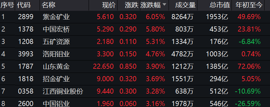 有色股集體走高,其中,紫金礦業(yè)(5.61, 0.00, 0.00%)漲超6%,中國宏橋(5.29, 0.00, 0.00%)漲5.8%,五礦資源(2.18, 0.00, 0.00%)、洛陽鉬業(yè)(3.3, 0.00, 0.00%)、山東黃金(22.65, 0.00, 0.00%)等集體走高。