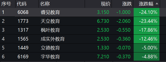 深改委強化民辦教育公益屬性,天立教育(6.73, -2.06, -23.44%)大跌23%,成實外教育(2.53,-0.36, -12.46%)跌12%,睿見教育(3.15, -1.00, -24.10%)跌24%,楓葉教育(2.53, -0.55, -17.86%)跌18%。