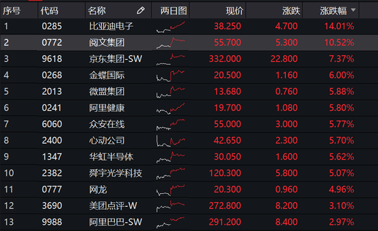 恒生科技股繼續(xù)強勢,小米近期升勢凌厲,13個交易日暴漲68%,近5個交易日漲41%,今日小米高開3.91%,收盤漲0.39%,昨日內(nèi)資再度增持3300萬股。閱文集團(55.7, 5.30, 10.52%)大漲10.5%,比亞迪(86.55, -1.10, -1.26%)電子(38.25, 4.70, 14.01%)漲14%,京東集團大漲7%,市值再度突破1萬億港元大關(guān),微盟、舜宇、阿里健康(19.7, 1.08, 5.80%)等集體大漲。