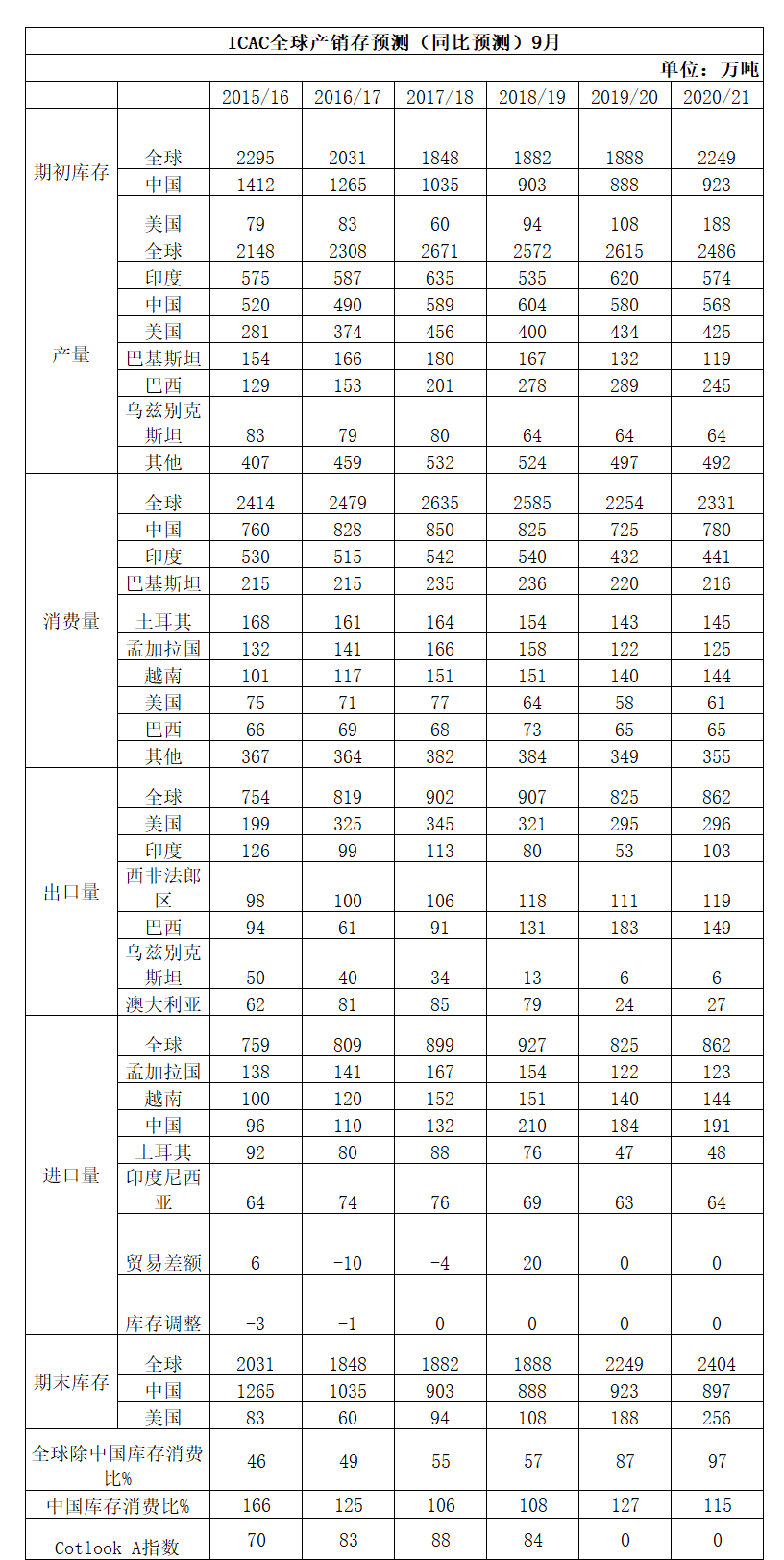 國際棉花咨詢委員會(ICAC)發(fā)布的9月份全球產(chǎn)需預(yù)測稱,疫情之下棉花市場復(fù)蘇程度有限,產(chǎn)量和庫存高企,消費(fèi)增長緩慢。