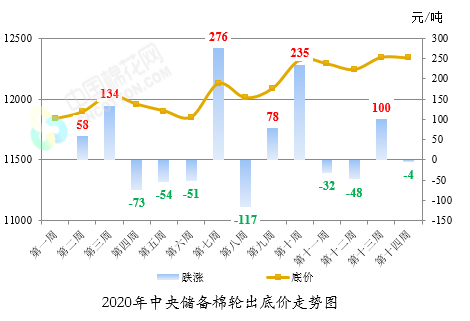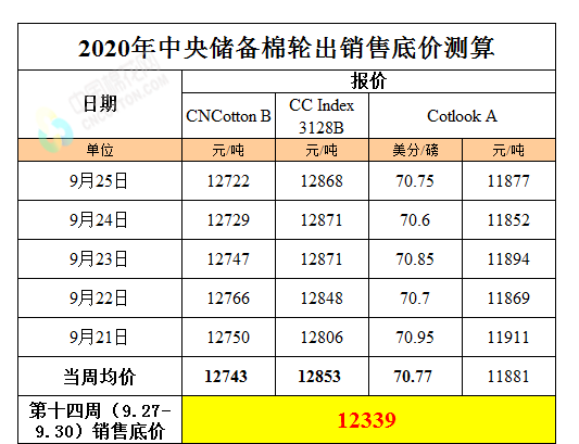 中國棉花網(wǎng)專訊:根據(jù)國家糧食和物資儲(chǔ)備局中華人民共和國財(cái)政部公告(2020年第1號)對中央儲(chǔ)備棉輪出銷售底價(jià)計(jì)算公式,第十四周(9月27日-30日)儲(chǔ)備棉輪出銷售底價(jià)為12339元/噸(折標(biāo)準(zhǔn)級3128B),較前一周下跌4元/噸。