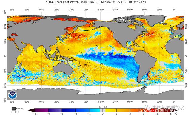2020年10月10日全球表層海溫偏高/偏低監(jiān)測,可見中東太平洋有大片冷水
