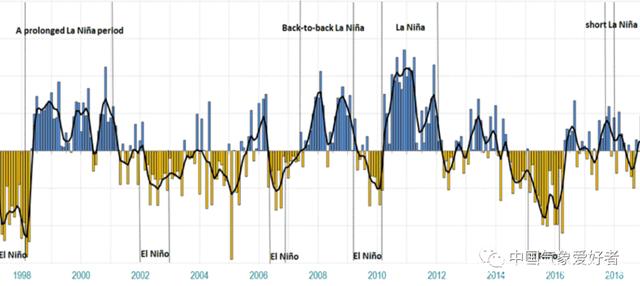 1998年以來厄而尼諾和拉尼娜時間序列示意圖