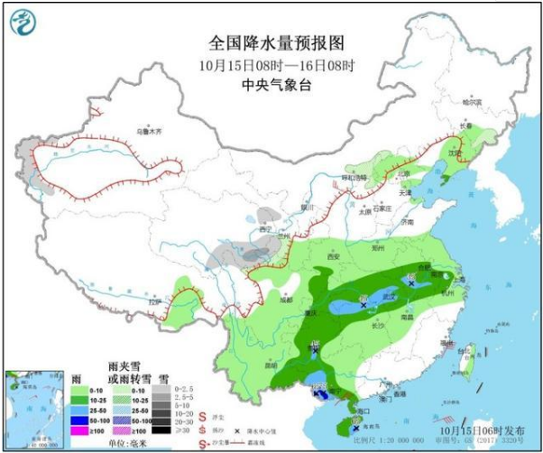 10月15日08時至16日08時,四川盆地東部、陜西南部、貴州大部、湖南北部、云南東南部、華南中西部和南部等地的部分地區(qū)有中雨或大雨,其中,廣西西南部、海南島東南部等地局地有暴雨(50~75毫米)。內(nèi)蒙古中部、廣西南部沿海等地部分地區(qū)有4~6級風。