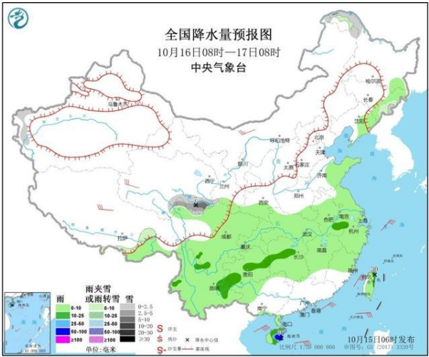 10月16日08時至17日08時,新疆南疆西部山區(qū)、黑龍江西北部、吉林東部、青海東南部等地部分地區(qū)有小雪或雨夾雪,局地有中到大雪。西北地區(qū)東南部、黃淮東部、江淮、江漢大部、江南大部、西南地區(qū)大部、海南島、臺灣島大部等地部分地區(qū)有小到中雨,其中,海南島東部、臺灣島東北部有大雨或暴雨。內(nèi)蒙古河套地區(qū)、青海西部等地部分地區(qū)有4~6級風。