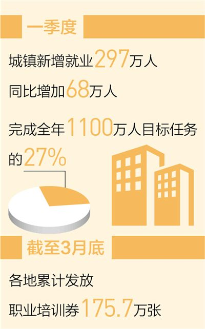 數(shù)據(jù)顯示,一季度,城鎮(zhèn)新增就業(yè)297萬(wàn)人,同比增加68萬(wàn)人,完成全年1100萬(wàn)人目標(biāo)任務(wù)的27%。