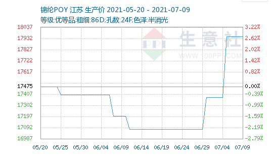 據(jù)生意社數(shù)據(jù)統(tǒng)計(jì)顯示,截止7月9日,江蘇地區(qū)錦綸長(zhǎng)絲DTY報(bào)20360元/噸,較6月底價(jià)格上漲700元/噸;錦綸POY價(jià)格報(bào)17950元/噸,較6月底價(jià)格上漲825元/噸;錦綸FDY價(jià)格報(bào)20933元/噸,較6月底價(jià)格上漲933元/噸。從價(jià)格走勢(shì)來(lái)看,當(dāng)前錦綸價(jià)格處高位,7月錦綸市場(chǎng)迎來(lái)首漲,主要受上游原料成本推動(dòng),錦綸市場(chǎng)全線上漲。