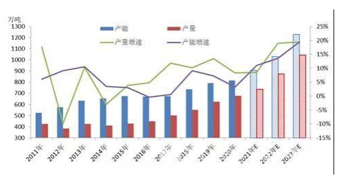 近10年直紡短纖產(chǎn)能、產(chǎn)量變化走勢(shì)圖