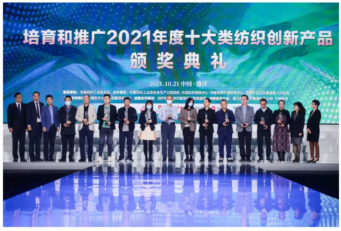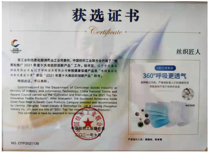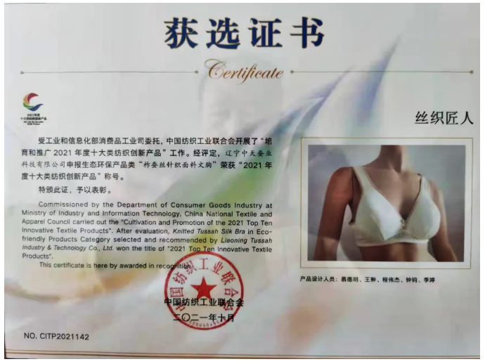 10月21日中國紡織工業(yè)聯(lián)合會,在蘇州市.盛澤.舉行“培育和推廣2021年度十大類紡織創(chuàng)新產(chǎn)品”頒獎(jiǎng)大會!遼寧省柞蠶絲聯(lián)盟單位:遼寧中天蠶業(yè)科技有限公司科技創(chuàng)新產(chǎn)品:柞蠶絲針織文胸、蠶絲無紡布口罩,分別榮獲“生態(tài)環(huán)保產(chǎn)品類”、“健康保健產(chǎn)品類”創(chuàng)新獎(jiǎng)。