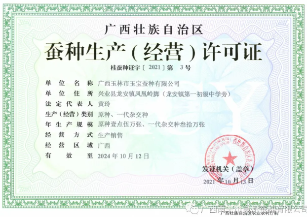 經(jīng)過(guò)近一年的改、擴(kuò)建,廣西玉林市玉寶蠶種有限公司于近日獲得自治區(qū)農(nóng)業(yè)農(nóng)村廳頒發(fā)的蠶種生產(chǎn)(經(jīng)營(yíng))許可證,核定生產(chǎn)能力桑蠶一代雜交種30萬(wàn)張、原種1.5萬(wàn)張。