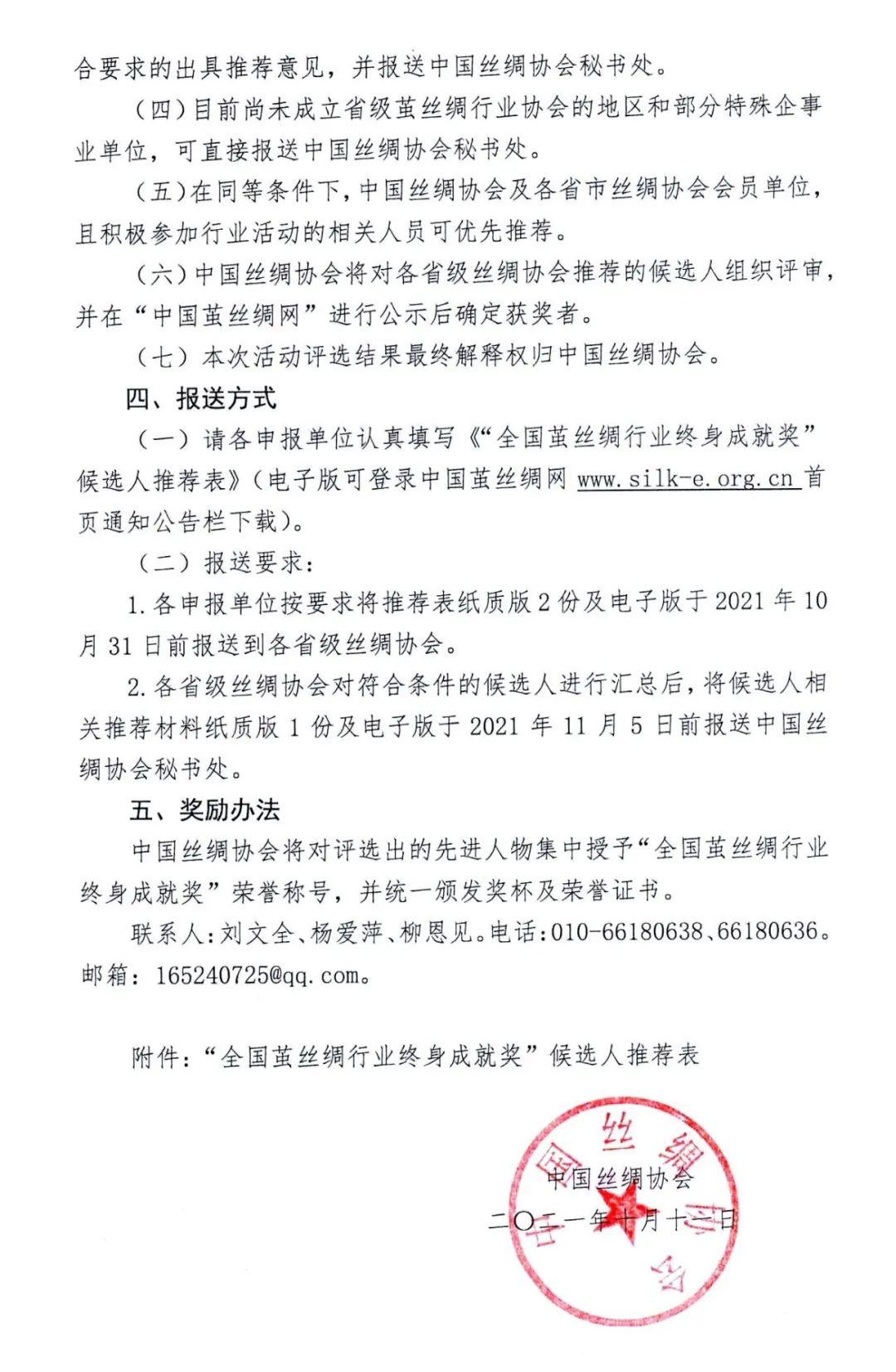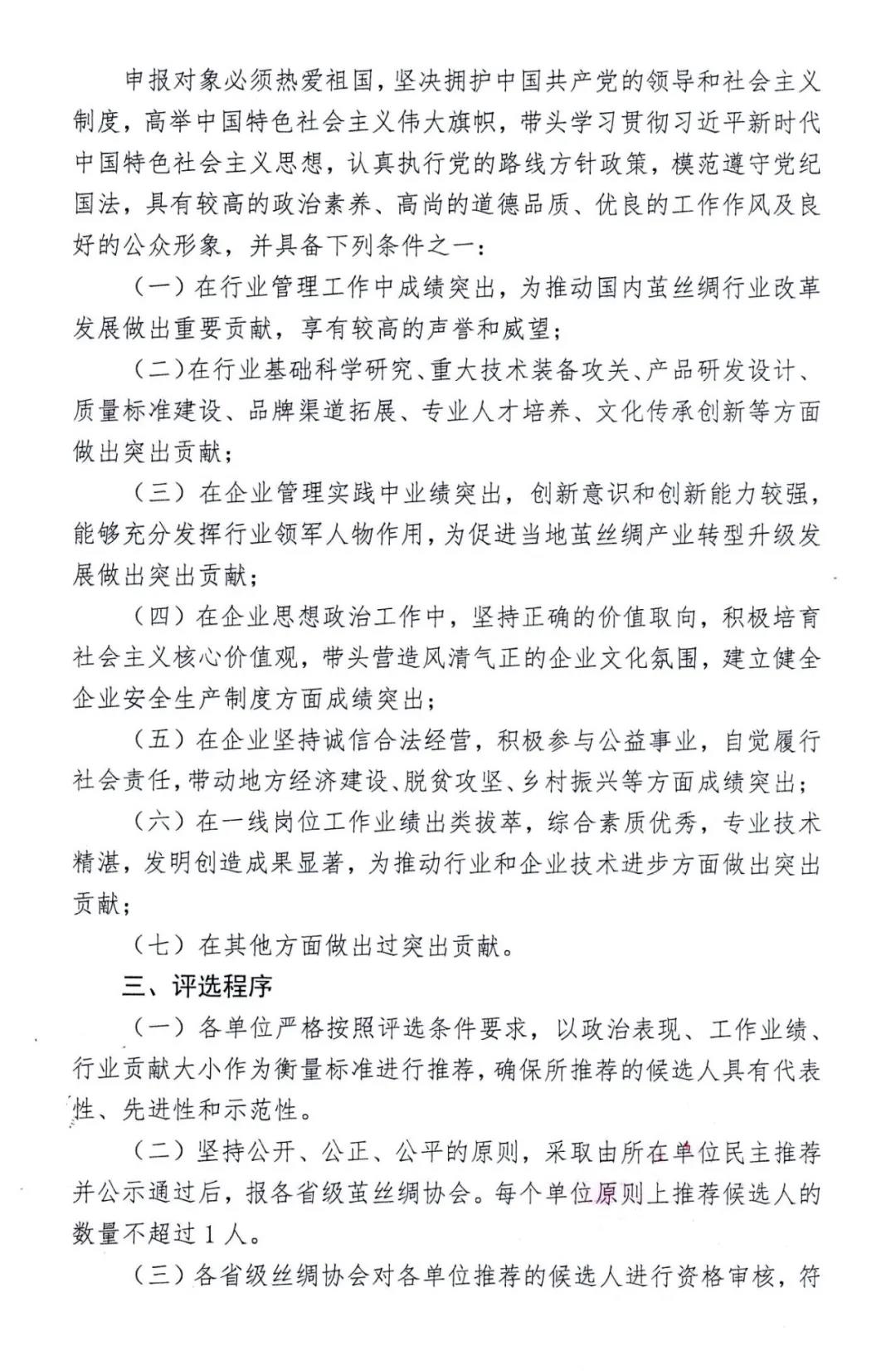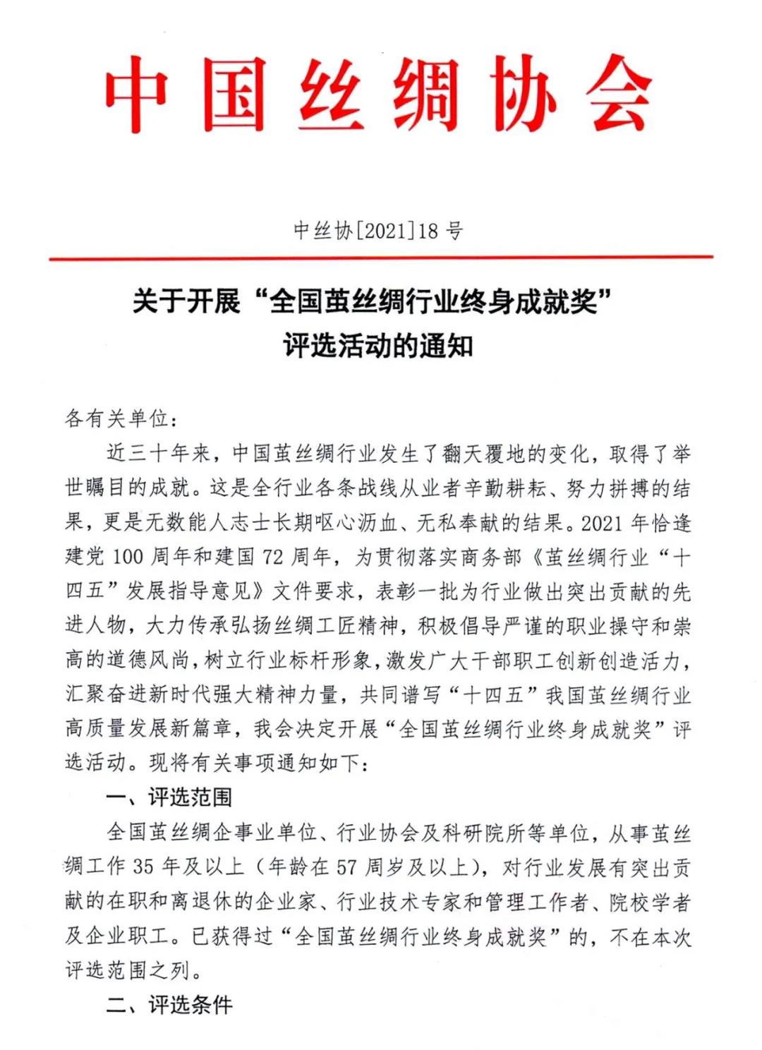 中國(guó)絲綢協(xié)會(huì)關(guān)于開(kāi)展“全國(guó)繭絲綢行業(yè)終身成就獎(jiǎng)”評(píng)選活動(dòng)的通知