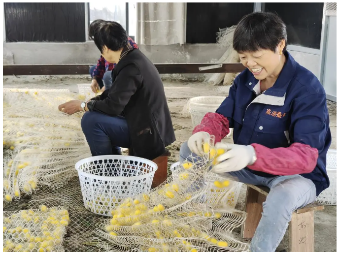 “今年晚秋蠶飼養(yǎng)期間,氣溫適宜,蠶病總體較少,桑園里的桑樹長(zhǎng)勢(shì)很好,蠶葉充足,因此這一茬的晚秋繭單產(chǎn)高、蠶層厚,從產(chǎn)量和質(zhì)量來(lái)看都算不錯(cuò)?!睋?jù)東池村蠶?;刎?fù)責(zé)人朱益明介紹,今年,東池村共發(fā)放晚秋蠶種400多張,已收蠶繭19噸,此次晚秋蠶繭收購(gòu)均價(jià)為42元每公斤,相比去年同期上漲5%。