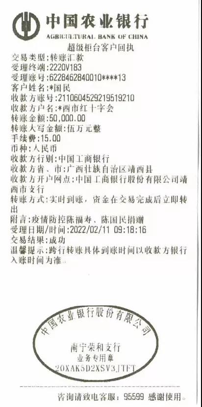 廣西平果時宜農(nóng)業(yè)開發(fā)有限公司在捐贈完第一批物資后,總經(jīng)理陳國民及其父親陳福壽今天再以個人名義向靖西縣紅十字會捐贈現(xiàn)金5萬元,全力支持百色靖西縣的抗疫工作。