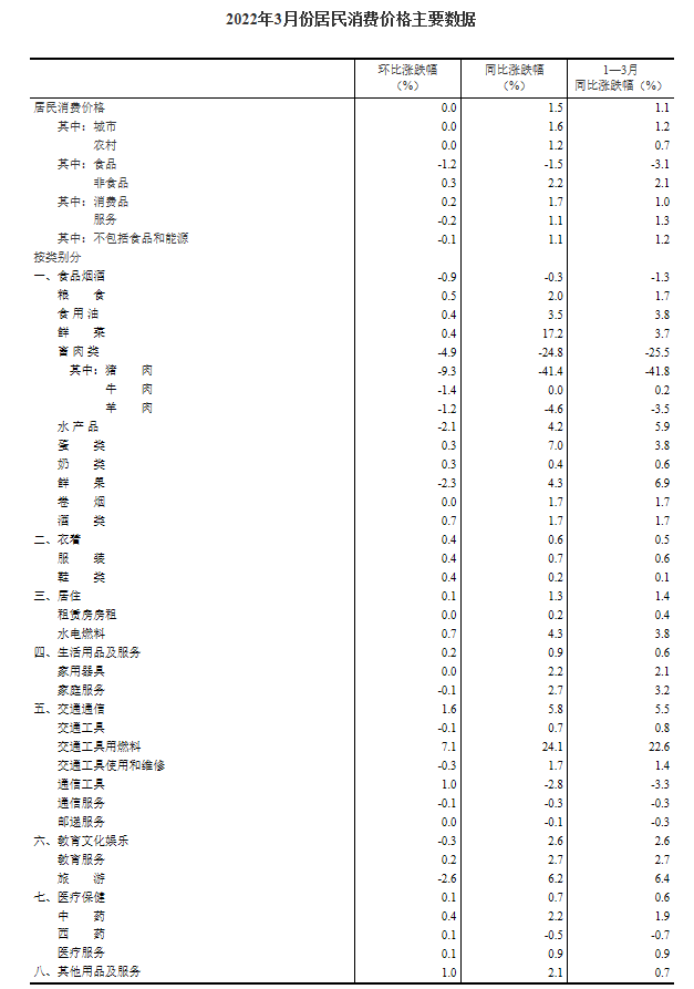 2022年3月份,全國居民消費(fèi)價(jià)格同比上漲1.5%。其中,城市上漲1.6%,農(nóng)村上漲1.2%;食品價(jià)格下降1.5%,非食品價(jià)格上漲2.2%;消費(fèi)品價(jià)格上漲1.7%,服務(wù)價(jià)格上漲1.1%。1—3月平均,全國居民消費(fèi)價(jià)格比上年同期上漲1.1%。