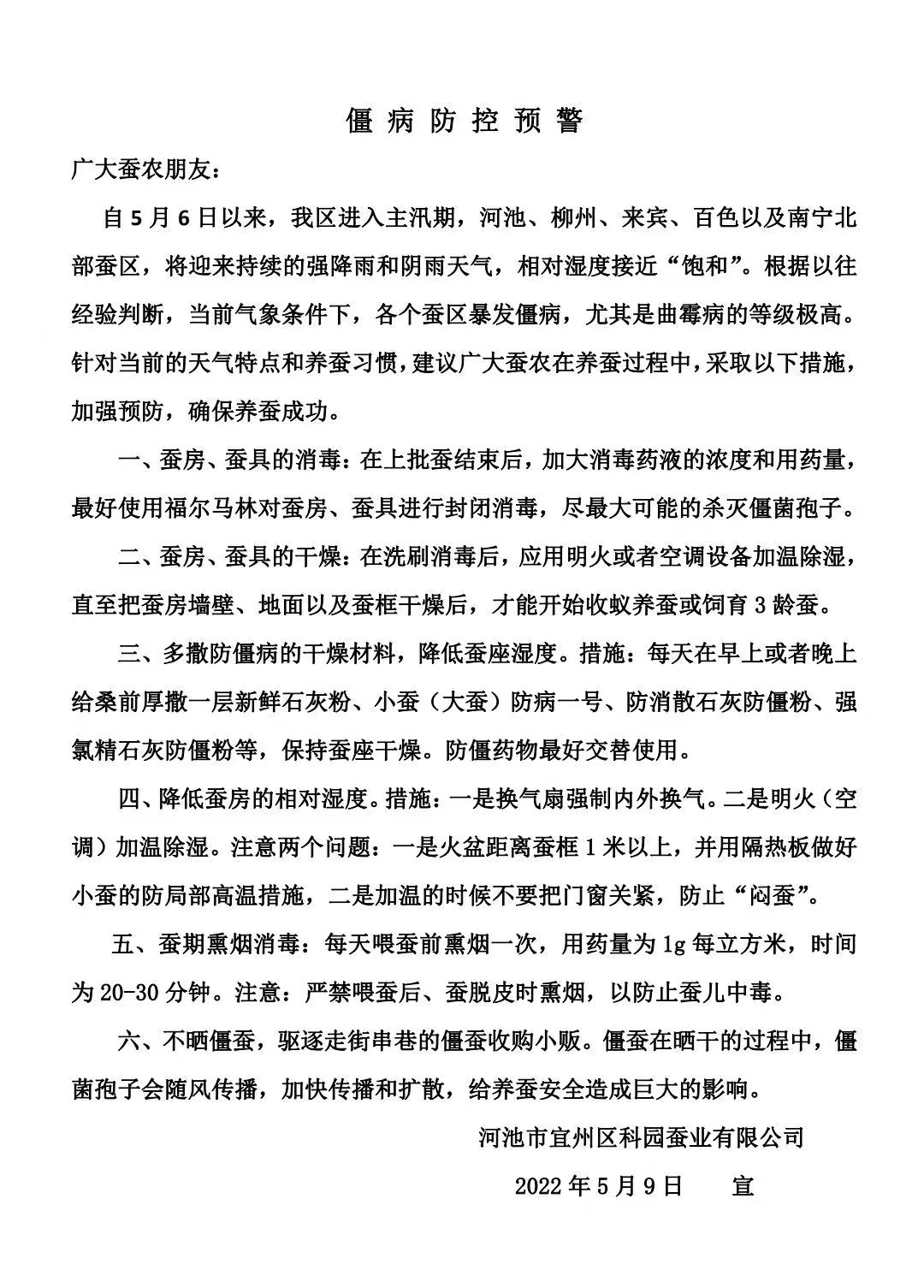 河池市宜州區(qū)科園蠶業(yè)有限公司結(jié)合近日天氣變化,制定了一系列應(yīng)對措施,并印發(fā)給蠶農(nóng)。