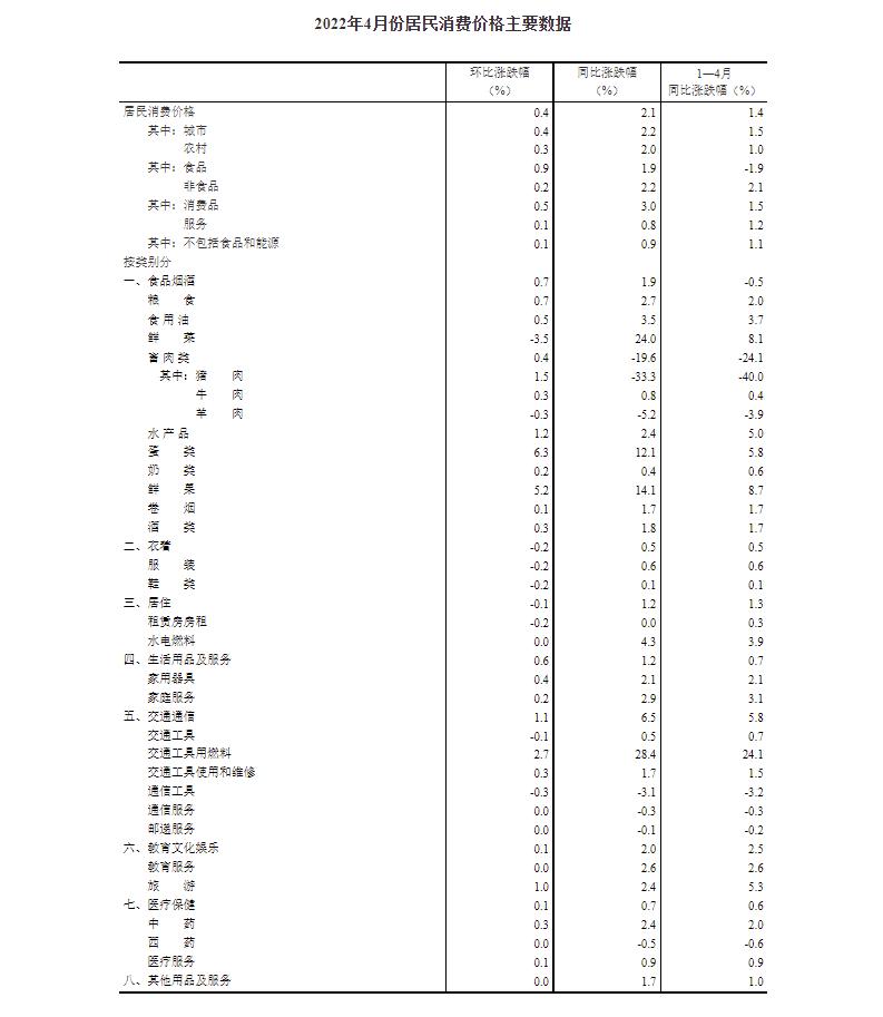 2022年4月份,全國居民消費價格同比上漲2.1%。其中,城市上漲2.2%,農(nóng)村上漲2.0%;食品價格上漲1.9%,非食品價格上漲2.2%;消費品價格上漲3.0%,服務價格上漲0.8%。1--—4月平均,全國居民消費價格比上年同期上漲1.4%。