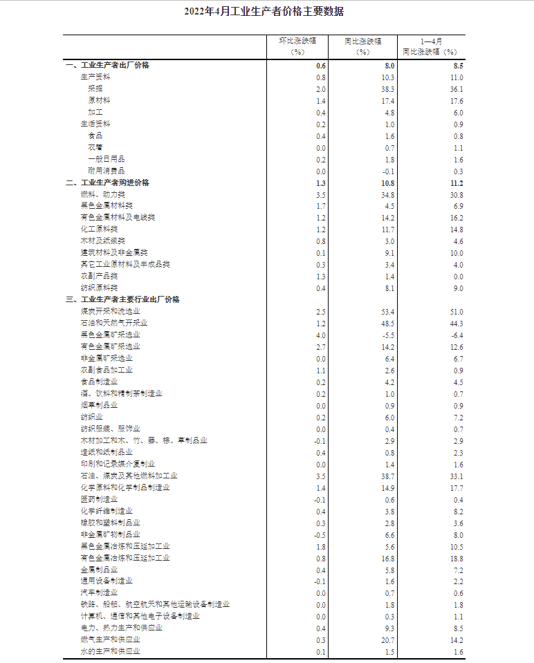 2022年4月份,全國工業(yè)生產(chǎn)者出廠價格同比上漲8.0%,環(huán)比上漲0.6%;工業(yè)生產(chǎn)者購進價格同比上漲10.8%,環(huán)比上漲1.3%。1—4月平均,工業(yè)生產(chǎn)者出廠價格比去年同期上漲8.5%,工業(yè)生產(chǎn)者購進價格上漲11.2%。