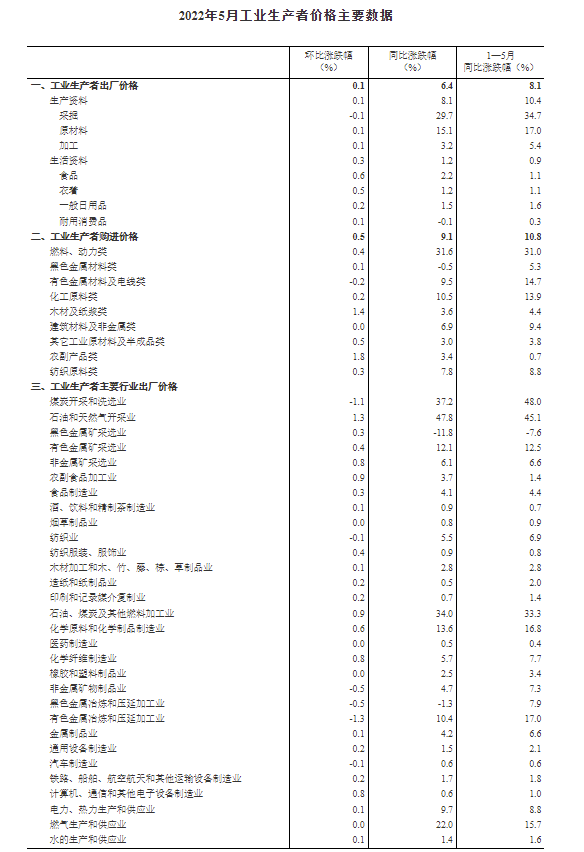 2022年5月份,全國(guó)工業(yè)生產(chǎn)者出廠價(jià)格同比上漲6.4%,環(huán)比上漲0.1%;工業(yè)生產(chǎn)者購(gòu)進(jìn)價(jià)格同比上漲9.1%,環(huán)比上漲0.5%。1—5月平均,工業(yè)生產(chǎn)者出廠價(jià)格比去年同期上漲8.1%,工業(yè)生產(chǎn)者購(gòu)進(jìn)價(jià)格上漲10.8%。
