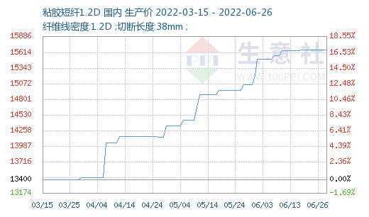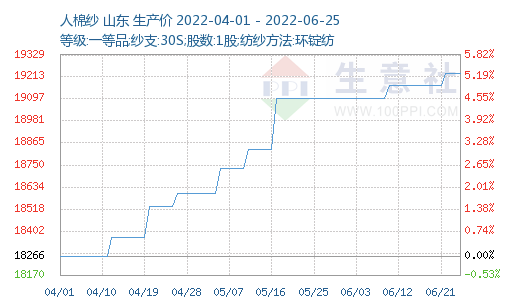 根據(jù)生意社價格監(jiān)測,截止至2022年6月26日,1.2D*38mm粘膠短纖國內(nèi)地區(qū)出廠報價為15660元/噸,價格穩(wěn)定。人棉紗價格處高位,穩(wěn)中有升,(30S,環(huán)錠紡,一等品)出廠均價為19233元/噸,較上周價格上調(diào)60元/噸。