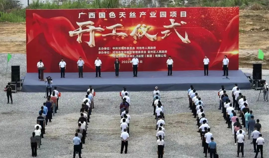 開工儀式由河池市副市長、宜州新區(qū)管委會主任陸景宇主持。在行業(yè)眾多企業(yè)家及相關(guān)人士的共同見證下,河池市王軍市長宣布項(xiàng)目正式開工。他在致辭中表示,廣西國色天絲產(chǎn)業(yè)園項(xiàng)目是廣西河池在推進(jìn)桑蠶繭絲綢產(chǎn)業(yè)高質(zhì)量發(fā)展路線上的一次有力實(shí)踐,也是推進(jìn)產(chǎn)業(yè)鏈延伸的“催化劑”,是在推動傳統(tǒng)產(chǎn)業(yè)智改數(shù)轉(zhuǎn)、轉(zhuǎn)型升級的代表,是河池市促進(jìn)循環(huán)節(jié)約、綠色發(fā)展的代表,是開展有機(jī)更新、整優(yōu)提升的代表,更是河池市推動桑蠶繭絲綢產(chǎn)業(yè)布局優(yōu)化、不斷延鏈、補(bǔ)鏈、強(qiáng)鏈的代表。