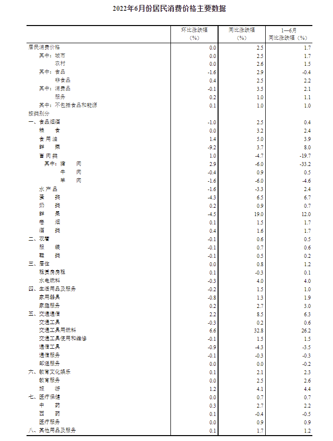 2022年6月份,全國(guó)居民消費(fèi)價(jià)格同比上漲2.5%。其中,城市上漲2.5%,農(nóng)村上漲2.6%;食品價(jià)格上漲2.9%,非食品價(jià)格上漲2.5%;消費(fèi)品價(jià)格上漲3.5%,服務(wù)價(jià)格上漲1.0%。1--—6月平均,全國(guó)居民消費(fèi)價(jià)格比上年同期上漲1.7%。