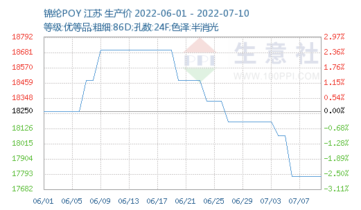 從價格走勢來看,上周(7月4-10)錦綸長絲價格延續(xù)下行,據(jù)生意社價格監(jiān)測顯示,截止7月10日,國內(nèi)錦綸POY(優(yōu)等品;86D/24F)報價17775元/噸,周下跌400元/噸,周跌幅2.20%。錦綸DTY(優(yōu)等品;70D/24F)報價19980元/噸,周下跌280元/噸,周跌幅1.38%。錦綸FDY(優(yōu)等品:40D/12F)報價20375元/噸,周下跌250元/噸,周跌幅1.21%。