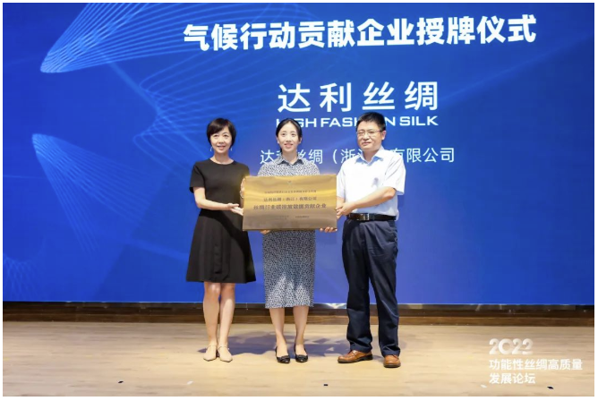 錢有清書記、閻巖主任為達(dá)利絲綢頒發(fā)【絲綢行業(yè)碳排放數(shù)據(jù)貢獻(xiàn)企業(yè)】牌匾,李斌紅主任為達(dá)利絲綢頒發(fā)【國(guó)家絲綢面料流行趨勢(shì)研究中心】牌匾。
