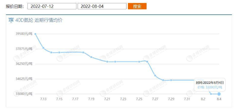根據(jù)全球紡織網(wǎng)價格監(jiān)測顯示,當(dāng)前國內(nèi)氨綸市場價格呈下跌走勢。截至發(fā)稿前,40D規(guī)格氨綸的市場均價在33000元/噸,圖表顯示七月12日,報價為39500元/噸,下跌16.5%。跟去年高點7月相比,數(shù)字更加觸目驚心!下跌44000,跌幅已超50%。